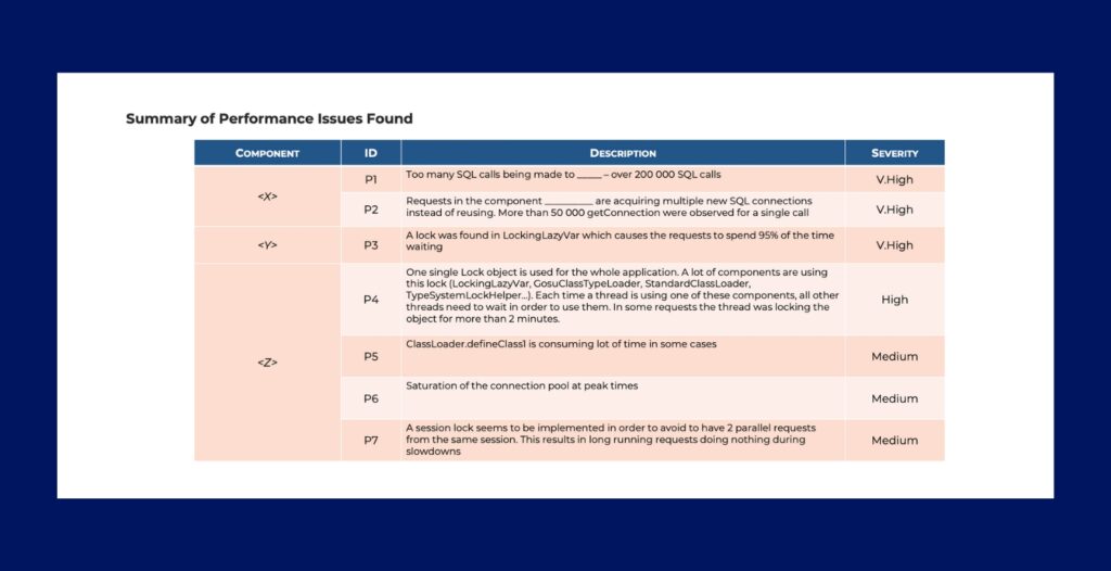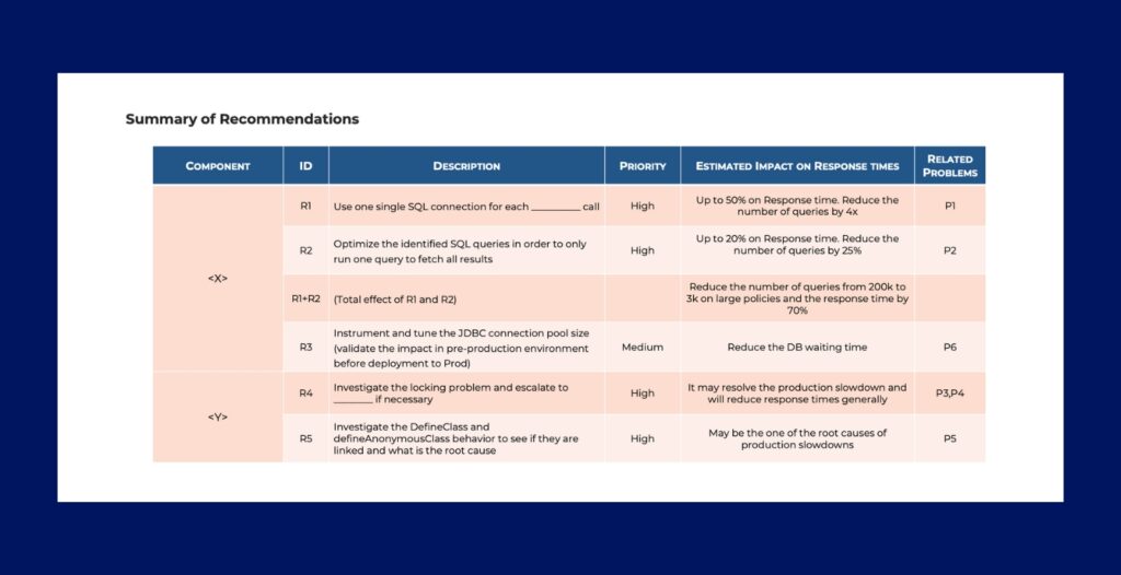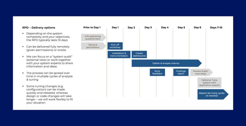 Rapid Application Performance Diagnosis is an expert approach designed to rapidly identify major malfunctions in an application system. It is based on a combination of field experience, tool-based analysis and precise, directly usable recommendations.