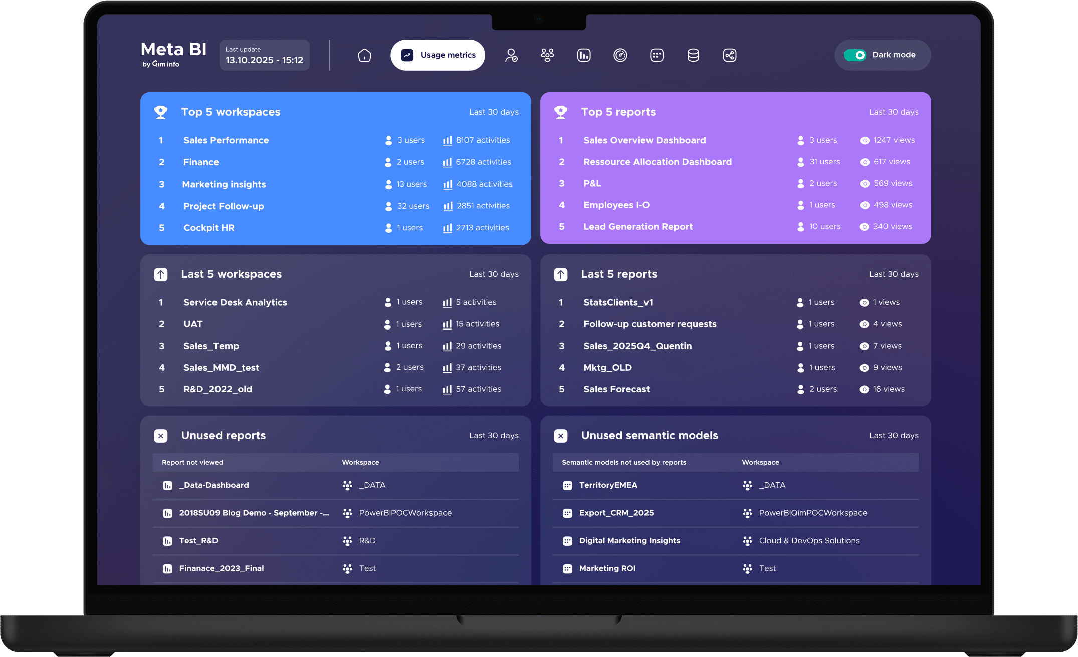 Seulement 90 jours d’historique, des métriques fastidieuses à remonter, des rapports dupliqués, des workspaces en pagaille… Power BI est puissant, mais il ne donne pas une vision claire de votre écosystème.