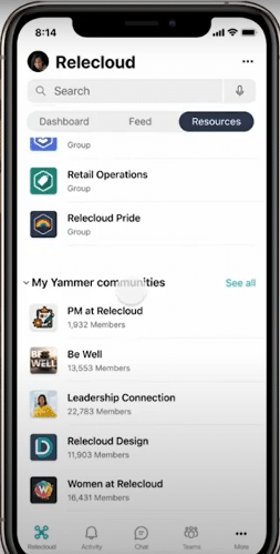 La section ressources de Viva Connections correspond principalement aux éléments que l’on retrouve dans la SharePoint App Bar c’est-à-dire la navigation globale qui a été paramétrée, les sites SharePoint fréquemment consultés et les sites suivis. On peut aussi y trouver les communautés Yammer auxquelles vous appartenez ainsi que les chaines Stream que vous suivez.